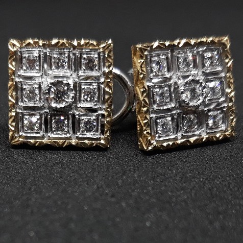 Orecchini in oro 18Kt traforati. Forma quadra, bordi modellati ed incisi a bulino con diamanti taglio brillante.